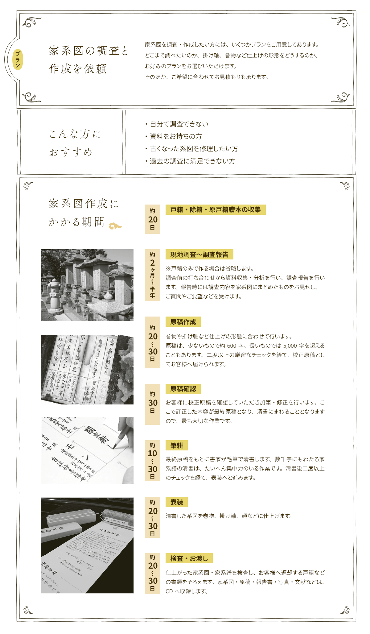 お客様の使用目的と系図の内容に合わせて、伝統的な書式を継承し、バランスの良い製品づくりを心がけております。そのため過不足のない調査方法、記録内容、仕上げ方法など、お客様本位のご提案を行っております。